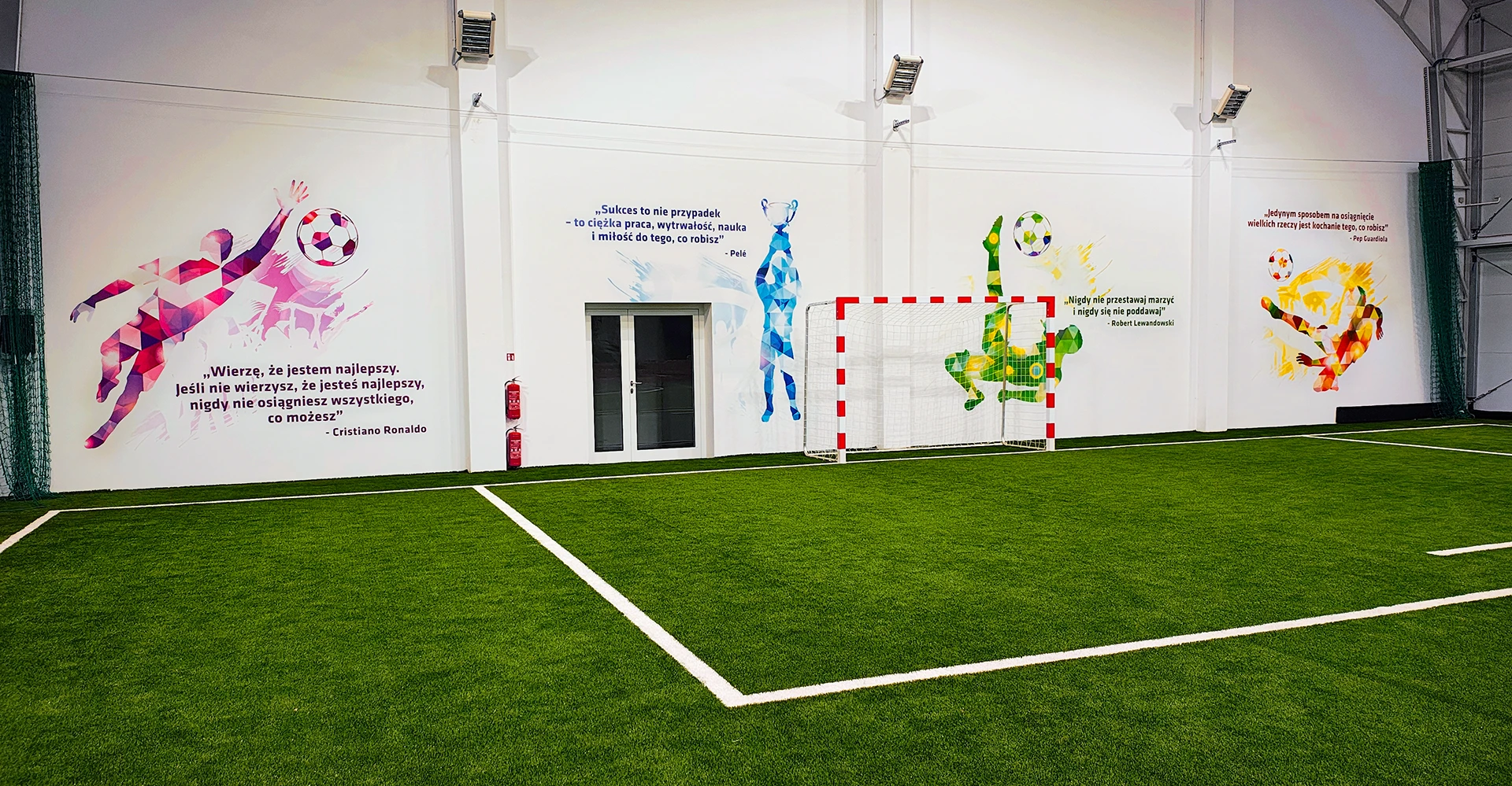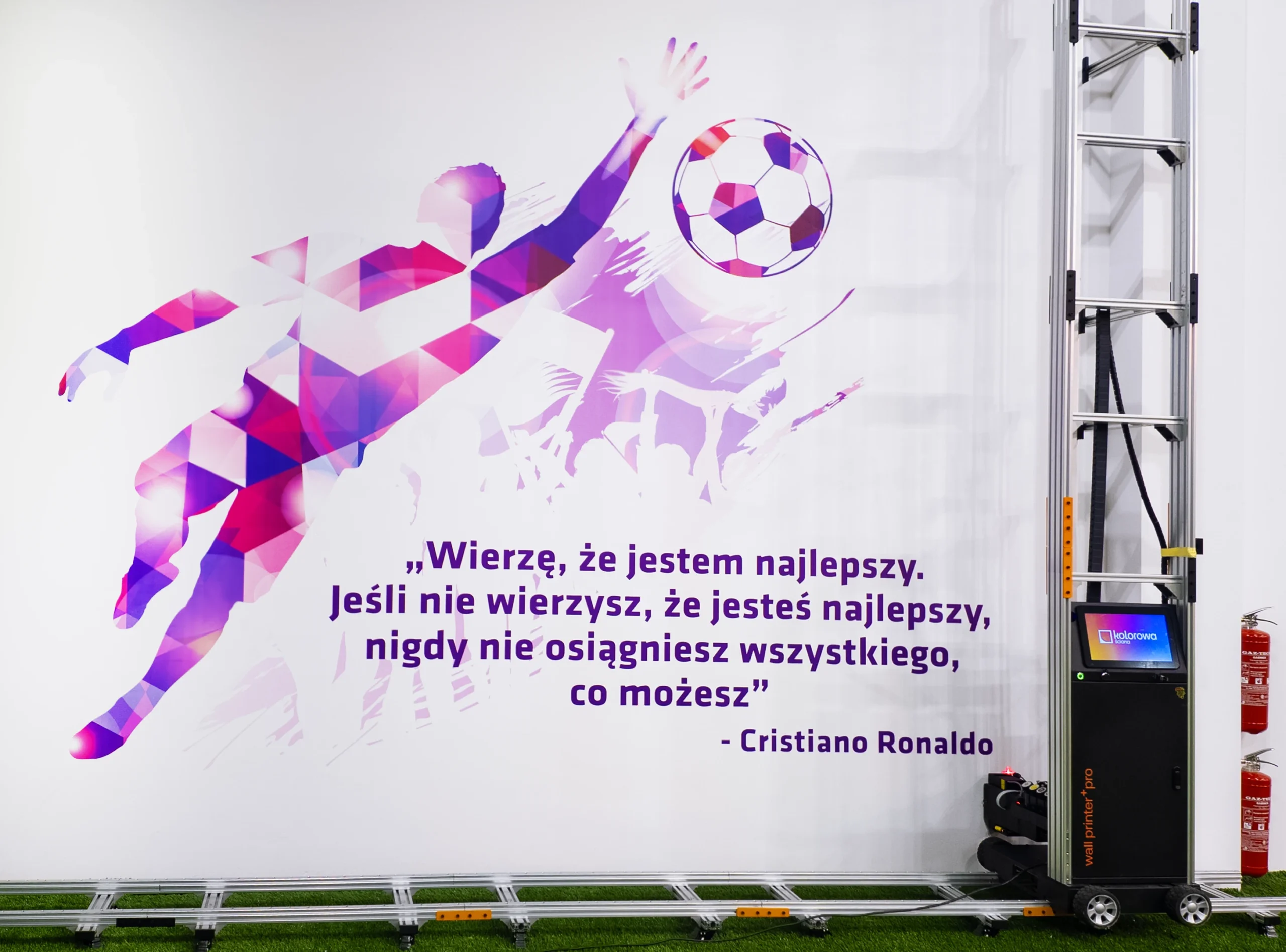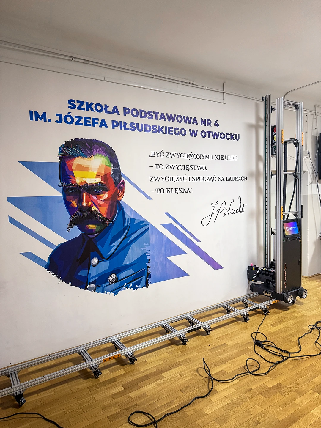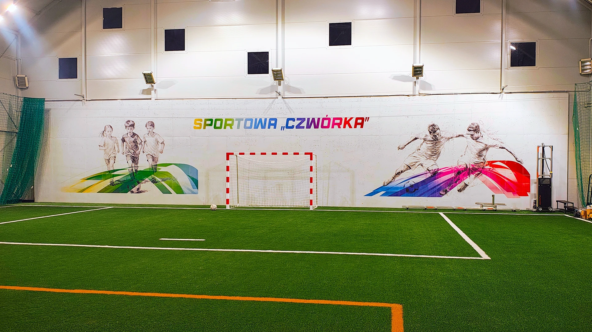 Łącznie zadrukowaliśmy ściany w 2 szkołach, m.in na hali sportowej oraz w salach lekcyjnych.